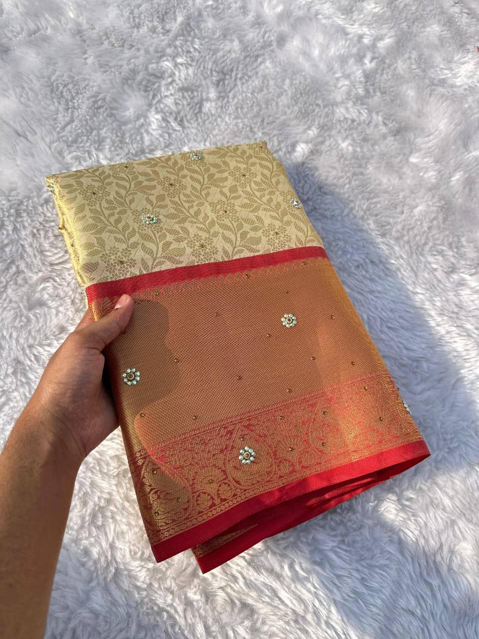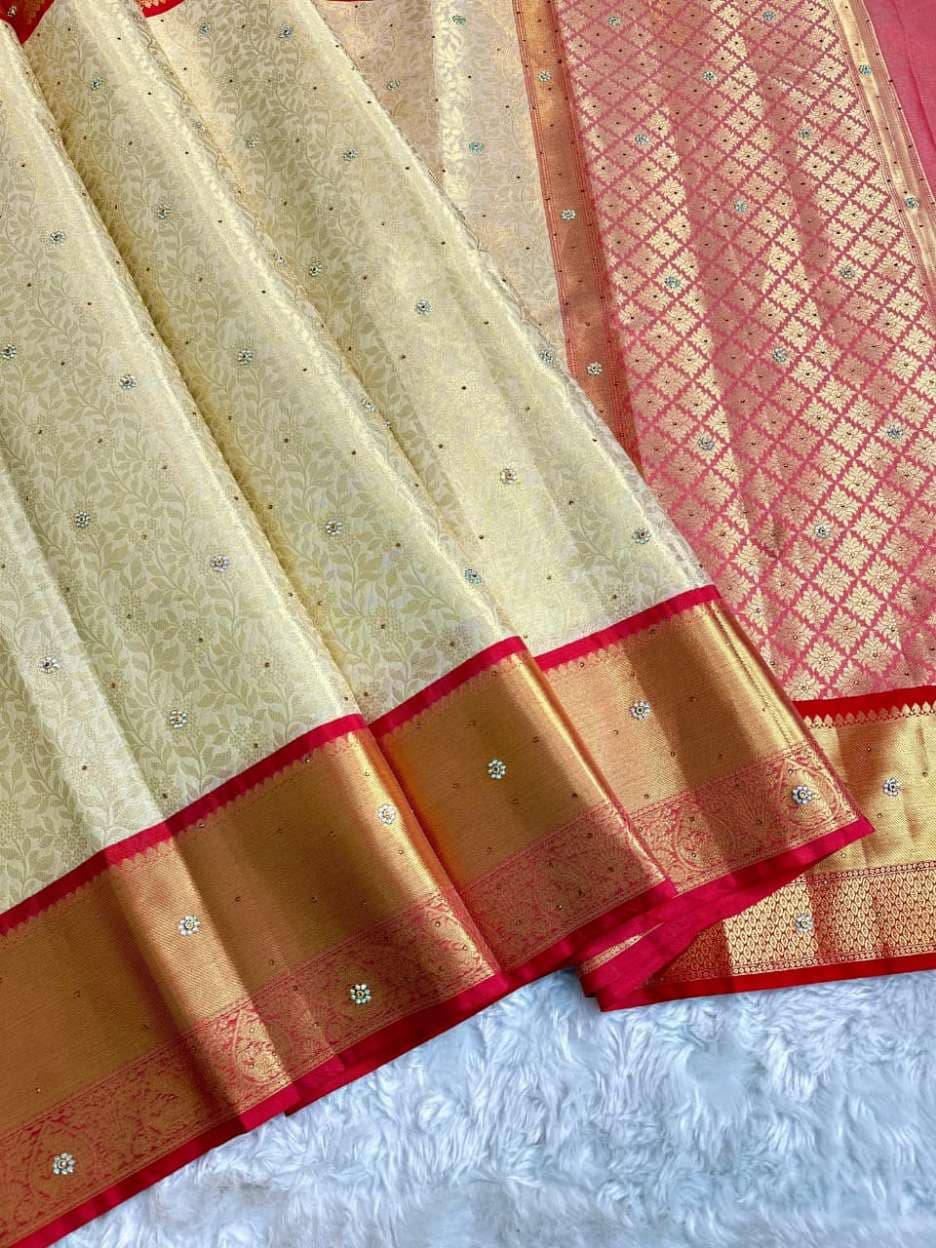 Premium Cream colour red border stone work sarees